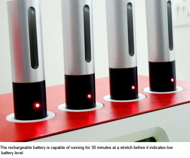 The rechargeable battery is capable of running for 30 minutes at a stretch before it indicates low battery level